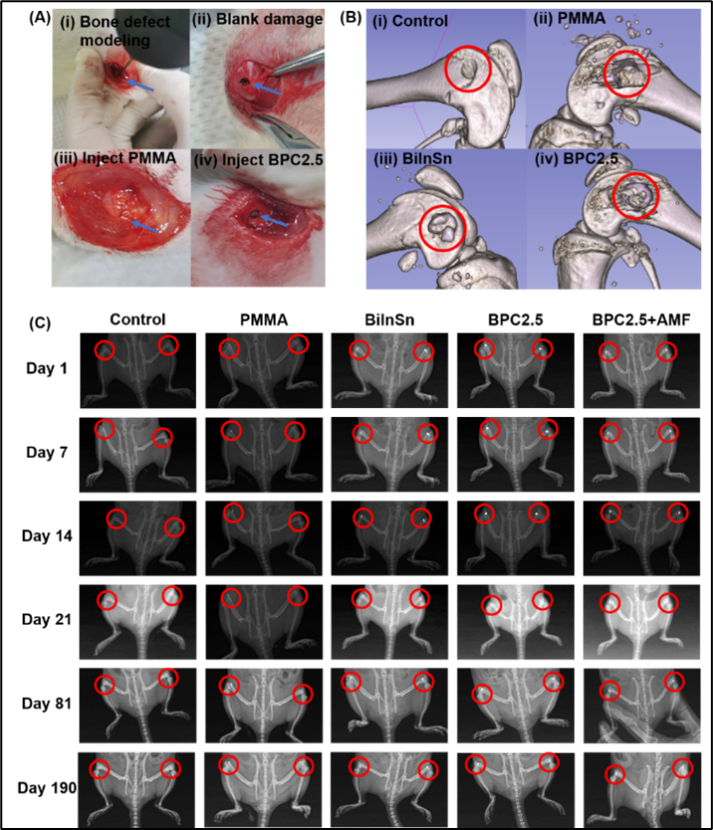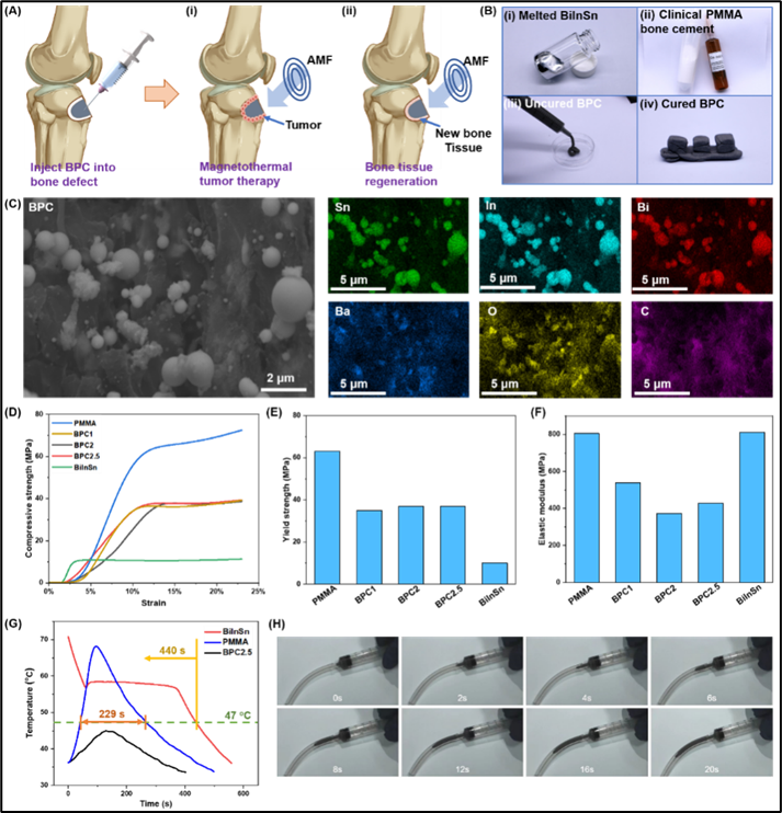 近日,yl23411永利医学科学与工程学院樊瑜波教授、王雪林助理教授团队联合北京朝阳医院张希诺副主任医师在国际知名期刊《Advanced Functional Materials》发表题为“可注射式铋基复合材料用于骨缺损修复实现骨肉瘤治疗和温和磁热骨再生(Injectable Bismuth-based Composite Enable Bone Defect Repair for Osteosarcoma Treatment and Mild Magnetothermal Bone Regeneration)”的论文。研究团队创新性的将低熔点铋基合金和临床骨水泥PMMA融合在一起,报道了一种可注射式铋基低熔点合金复合材料(BPCs),抗压强度提升252%,通过微创注射实现骨缺损精准填充,再利用交变磁场激活磁热效应,实现骨肉瘤治疗与促进骨再生。该研究攻克了传统金属内固定物需开放手术植入、及骨水泥产热损伤和功能单一等临床难题,为骨肿瘤切除术后修复提供“治疗-再生”一体化解决方案,创新了骨修复治疗模式。王雪林助理教授、崔紫亮(北航yl23411永利硕士研究生)和贾奇翰(北航材料学院硕士研究生)为论文第一作者,樊瑜波教授、张希诺副主任医师(北京朝阳医院)和王雪林助理教授共同担任论文通讯作者,yl23411永利医学科学与工程学院为论文第一完成单位。