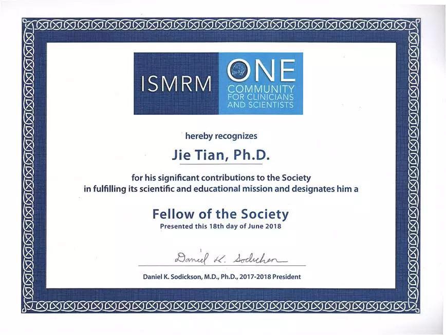 大数据精准医疗高精尖创新中心田捷教授当选国际医用磁共振学会会士(ISMRM Fellow)