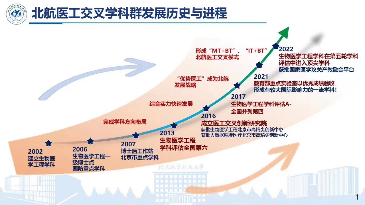 yl23411永利依托北航顶尖工科,笃行医工交叉、两个面向(面向医疗装备与器械、面向航空航天生命保障)的发展理念,以与人民健康密切相关的世界科技前沿和国家战略需求为导向,深度推进优势工科与生物医学交叉融合,形成了北航医工交叉融合的“MIBT”模式(MT+BTIT+BT)。2022年“优势医工”建设取得了历史性、标志性突破,生物医学工程学科在第五轮学科评估中进入顶尖学科行列、获批创建高端医疗装备与器械国家医学攻关产教融合创新平台(医工结合方向)。通过高起点规划、高质量建设,经过二十年跨越式发展,北航医工已成为接轨国际、全国顶尖的医工交叉人才培养和科学研究基地,获得了国内外同行的高度认可。