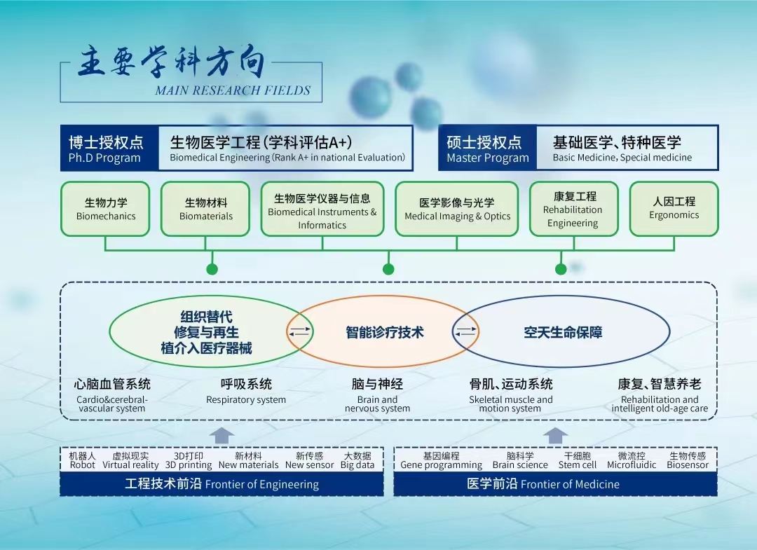 2、生物与医学工程学院:生物医学工程、力学、计算机科学与技术、控制科学与工程、材料科学与工程、信息与通信工程、电子科学与技术、基础医学、临床医学、特种医学。