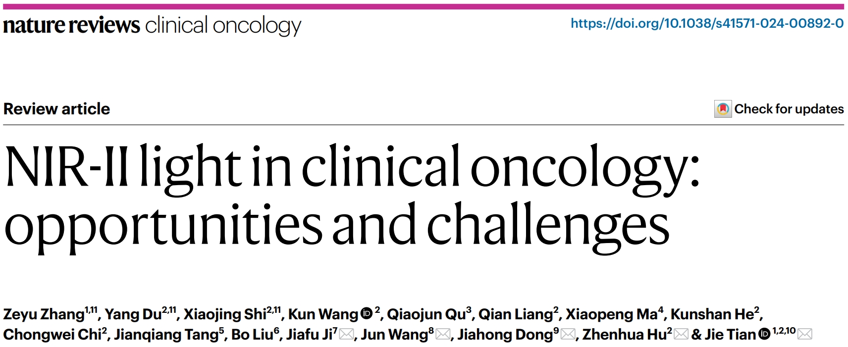 在近红外二区技术亟待临床突破的这一关键时期,yl23411永利医学科学与工程学院张泽宇副教授、中国科学院分子影像重点实验室杜洋研究员与史小静助理研究员为共同第一作者;田捷教授、胡振华研究员、清华大学董家鸿教授、北京大学人民医院王俊教授、北京大学北京肿瘤医院季加孚教授作为通讯作者,联合国内多家单位的十余位作者共同撰文,在《Nature Reviews Clinical Oncology》(中科院一区TOP,IF = 78.8)上发表了题目为“NIR-II light in clinical oncology: opportunities and challenges”的综述论文,系统性地回顾了近红外二区技术在临床肿瘤治疗中的代表性进展,并围绕“降低复发率、提高生存率、减少并发症”等方面归纳了新技术带来的典型临床获益,提出了促进新技术成果临床转化的可行策略,为临床肿瘤相关领域的医生、科研人员、工程技术人员等认知近红外二区技术的发展现状和趋势提供了良好的参考。