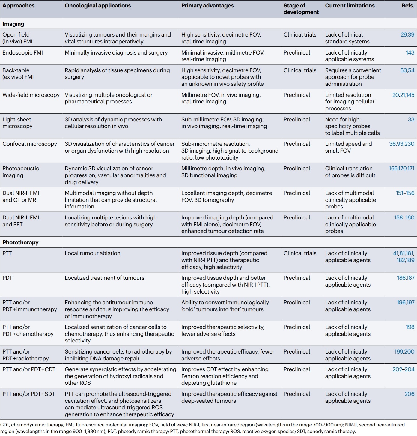 图3. 部分新兴近红外二区技术在肿瘤治疗中的特色优势及其在临床转化中的挑战