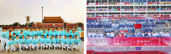 左图:参与庆祝中国共产党成立100周年大会合唱团的北航师生在天安门广场合影 右图:在北京2022年冬奥会、冬残奥会中,北航师生志愿者承担服务保障任务