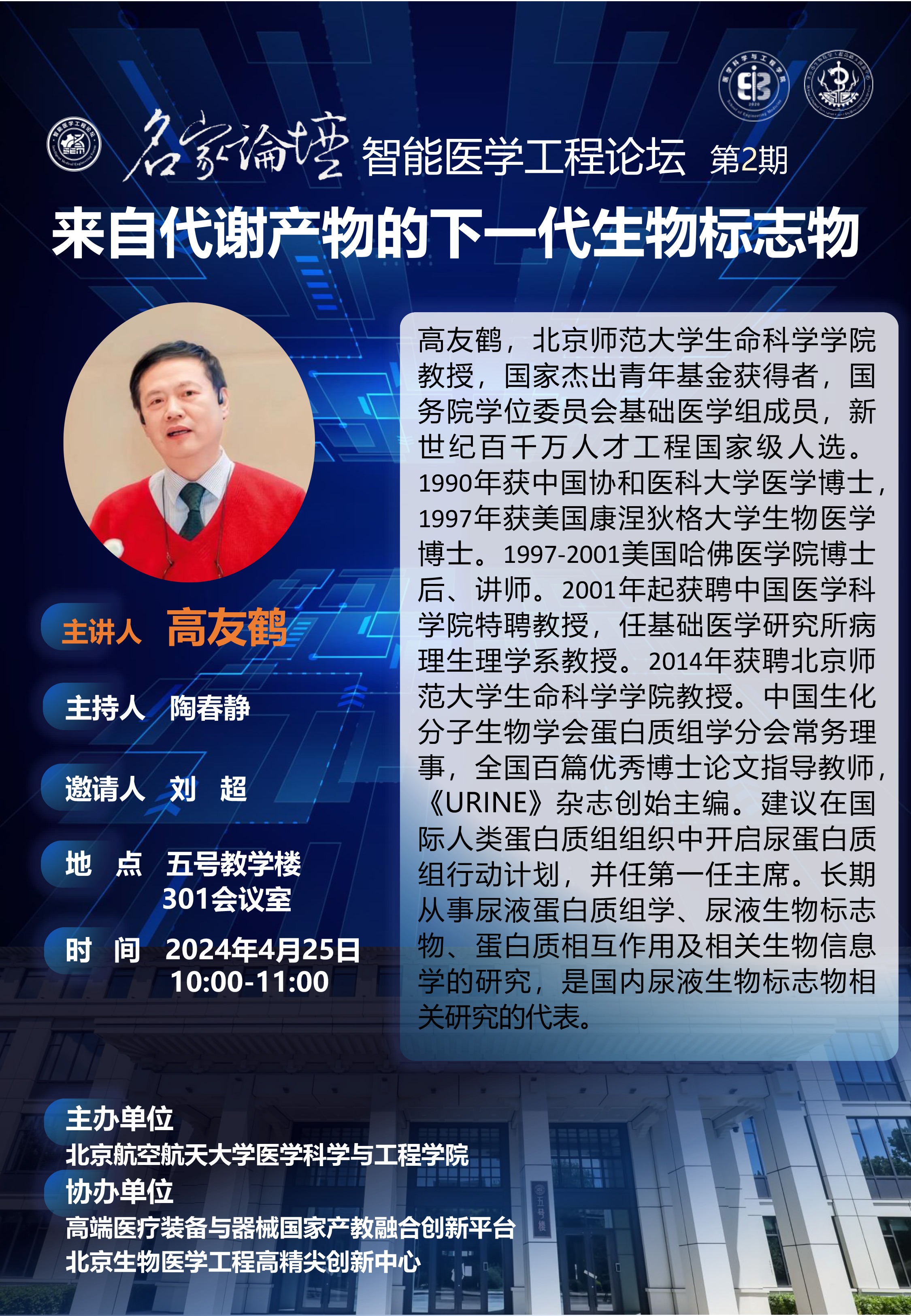 医学科学与工程学院智能医学工程论坛特邀报告医学科学与工程学院智能医学工程论坛特邀报告报告人:高友鹤北京师范大学生命科学学院教授,国家杰出青年基金获得者,国务院学位委员会基础医学组成员,新世纪百千万人才工程国家级人选 报告题目:来自代谢产物的下一代生物标志物报告时间:2024年4月25日(星期四)10:00-11:00报告地点:yl23411永利5号楼301主办单位:医学科学与工程学院主持人:陶春静邀请人:刘 超协办单位:高端医疗装备与器械国家产教融合创新平台北...