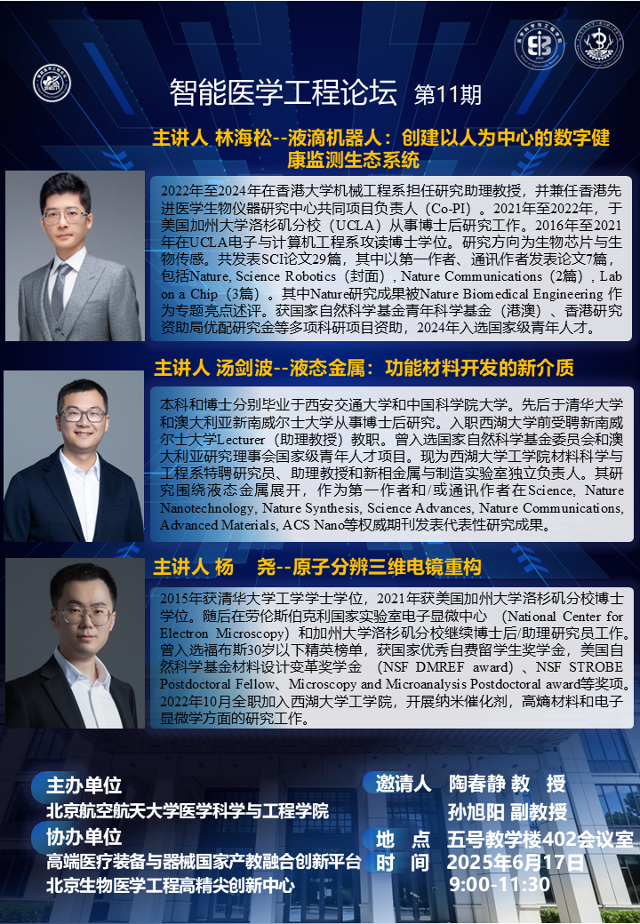 医学科学与工程学院智能医学工程论坛(第11期)特邀报告报告人:林海松西湖大学工学院特聘研究员、助理教授报告题目:液滴机器人:创建以人为中心的数字健康监测生态系统报告人:汤剑波西湖大学工学院特聘研究员,助理教授报告题目:液态金属:功能材料开发的新介质报告人:杨尧西湖大学工学院特聘研究员,助理教授报告题目:原子分辨三维电镜重构报告时间:2025年6月17日(星期二)9:00-11:30报告地点:yl23411永利五号教学楼402会议室主办单位:医学科学与工程学院邀请人:...